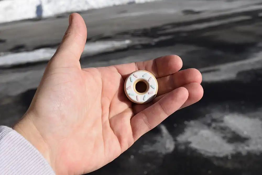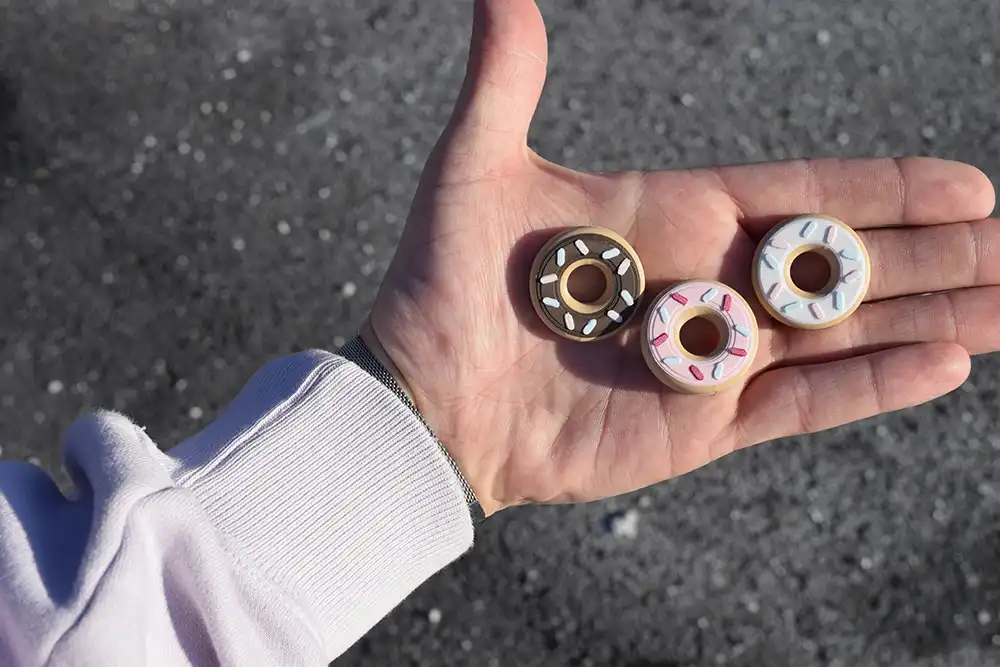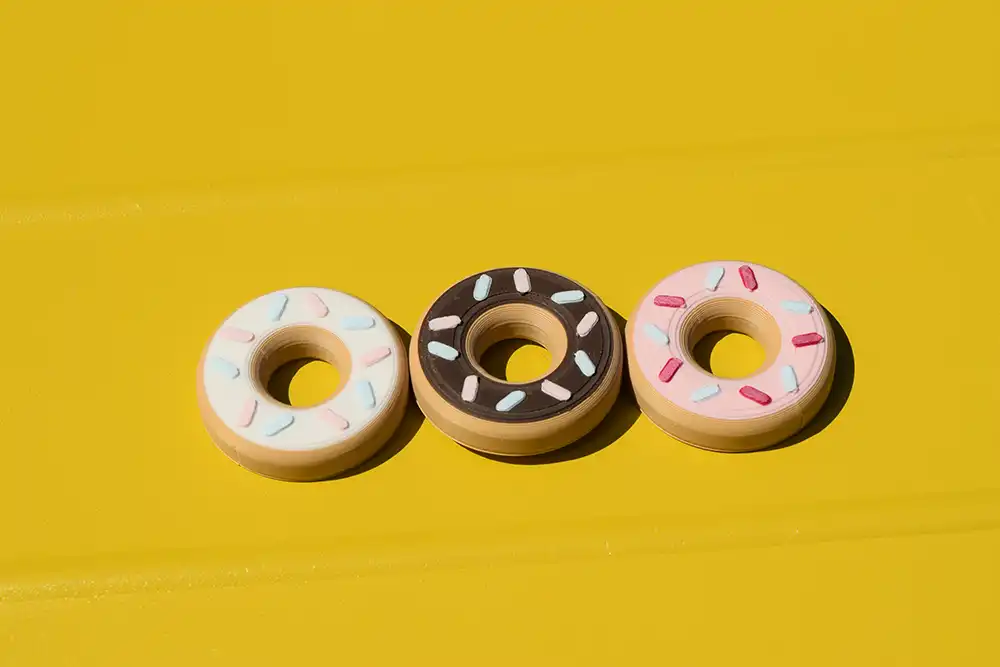 A playful donut-shaped fidget slider with hand-painted gel sprinkles and smooth magnetic motion. Sweet, satisfying, and designed to keep your hands busy and your mind focused.