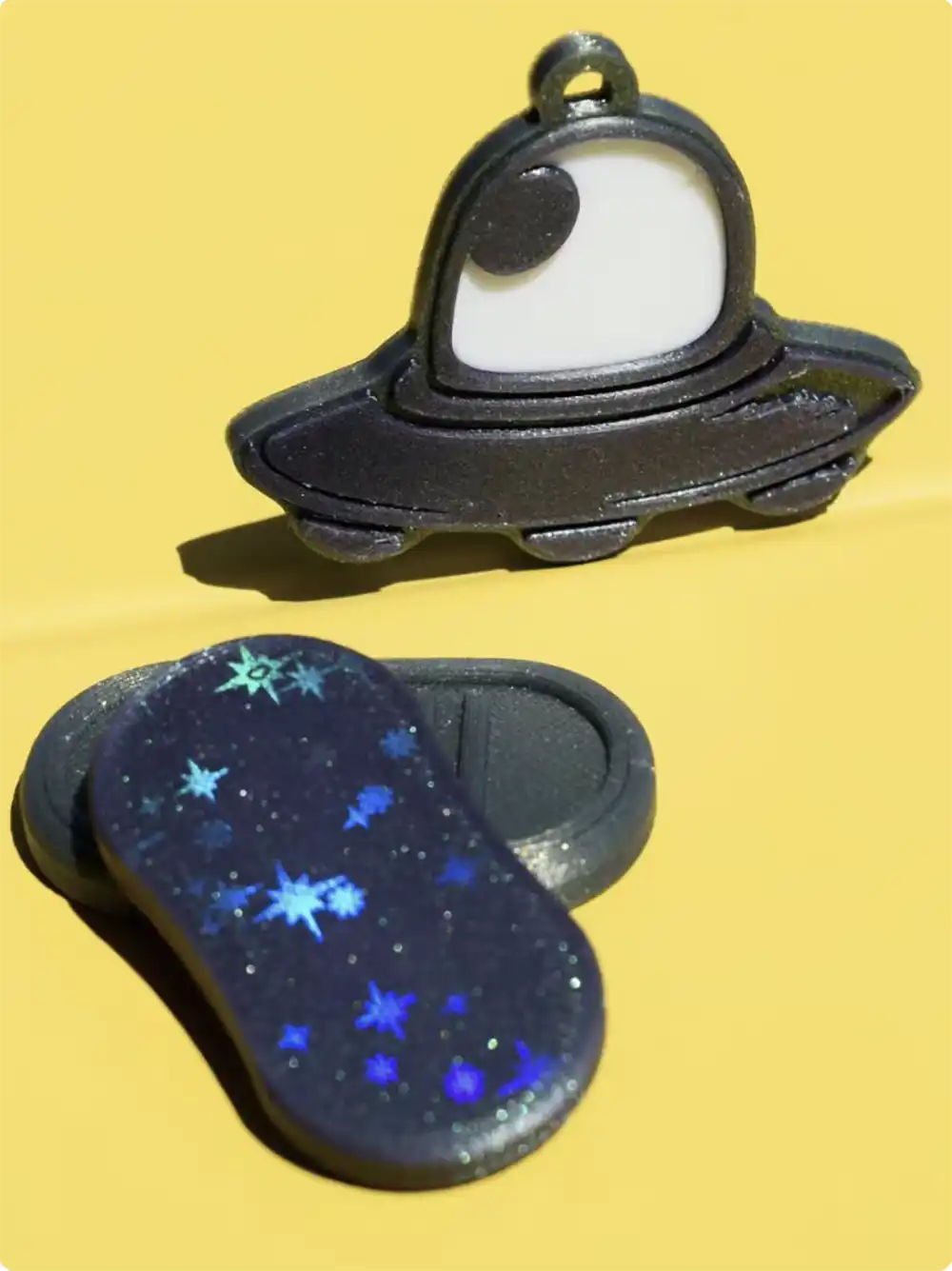 A cosmic-inspired fidget slider featuring shimmering galaxy colors, dual textures, and smooth, satisfying motion. Includes a free UFO keychain charm for an extra touch of fun.